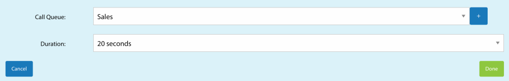 This call queue, named Sales, will hold the caller for up to 20 seconds before returning control to the originating call flow.