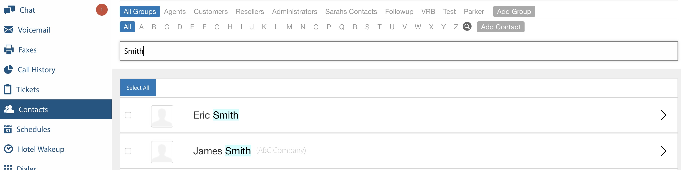 Use the search bar at the top of the contacts page to quickly find contacts by: