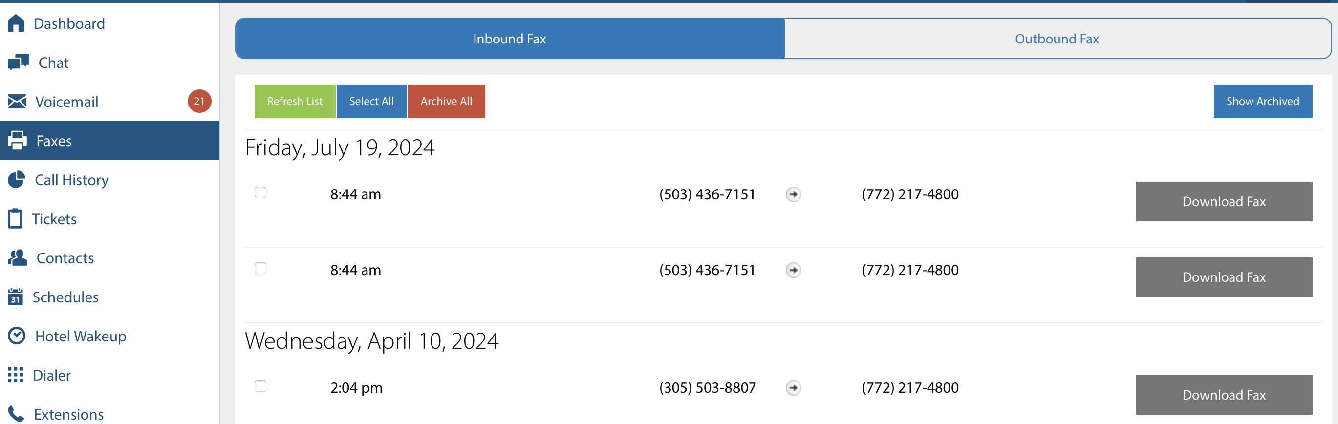Incoming faxes appear in your fax inbox. Each entry shows: