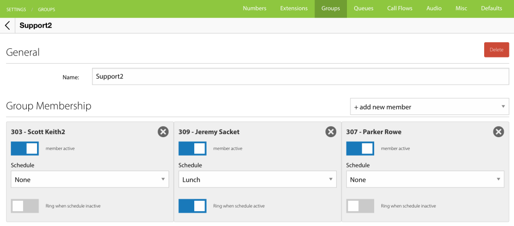 To add a member to a group, select an extension from the “+ add new member” popup. When schedule is set to “none,” the membership is not controlled by a schedule and is either active or inactive according to the status of the group.